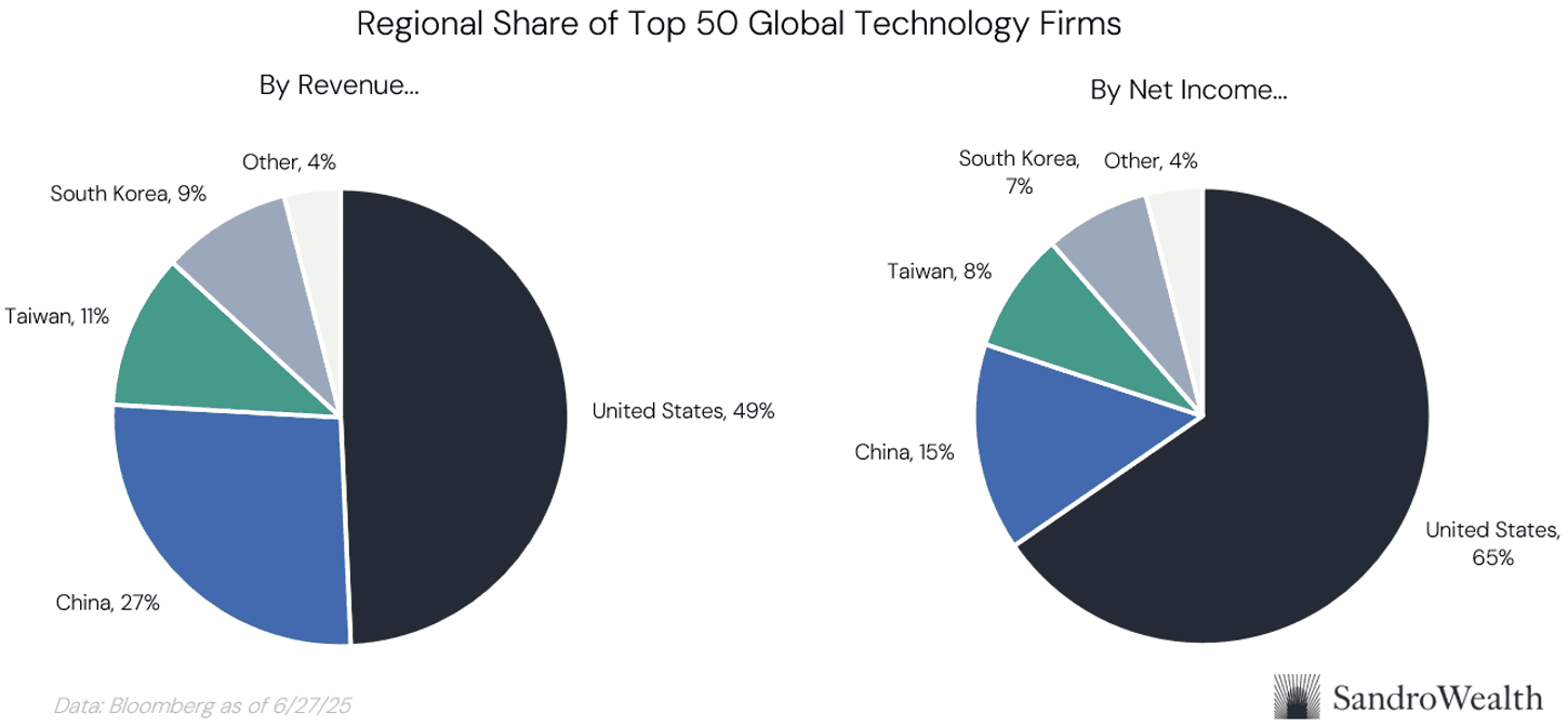 This capacity for innovation is perhaps best exemplified by America’s astounding 656 private startups with over a $1 billion valuation. In comparison, China has just 168. Further evidence can be found in America’s profit share within the technology sector. Of the top 50 tech companies in the world, US-based firms account for 49% of total revenue and 65%