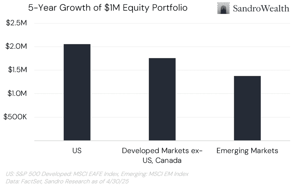 At Sandro Wealth, we have long held the view that the United States economy holds sustainable structural advantages compared to the rest of the world. This view justifies significantly overweight portfolio allocations to US markets. As the chart below illustrates, a client invested in US public equities over the past five years would be significantly better off than a client invested in other regions of the world. While recent policy shifts have contributed to elevated market volatility and investment uncertainty, they have not undermined America’s enduring strengths.