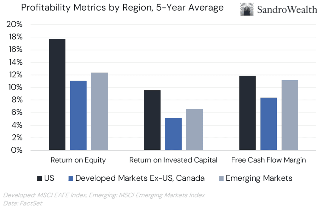 Based on these five forces, the US ranks first in Sandro’s Global Investment Framework, eclipsing the 17 other countries analyzed. This lead is robust, ranking 26% ahead of runner-up South Korea and 42% ahead of the median score. As a result of this analysis, Sandro currently has zero weight to non-US equities within client portfolios.