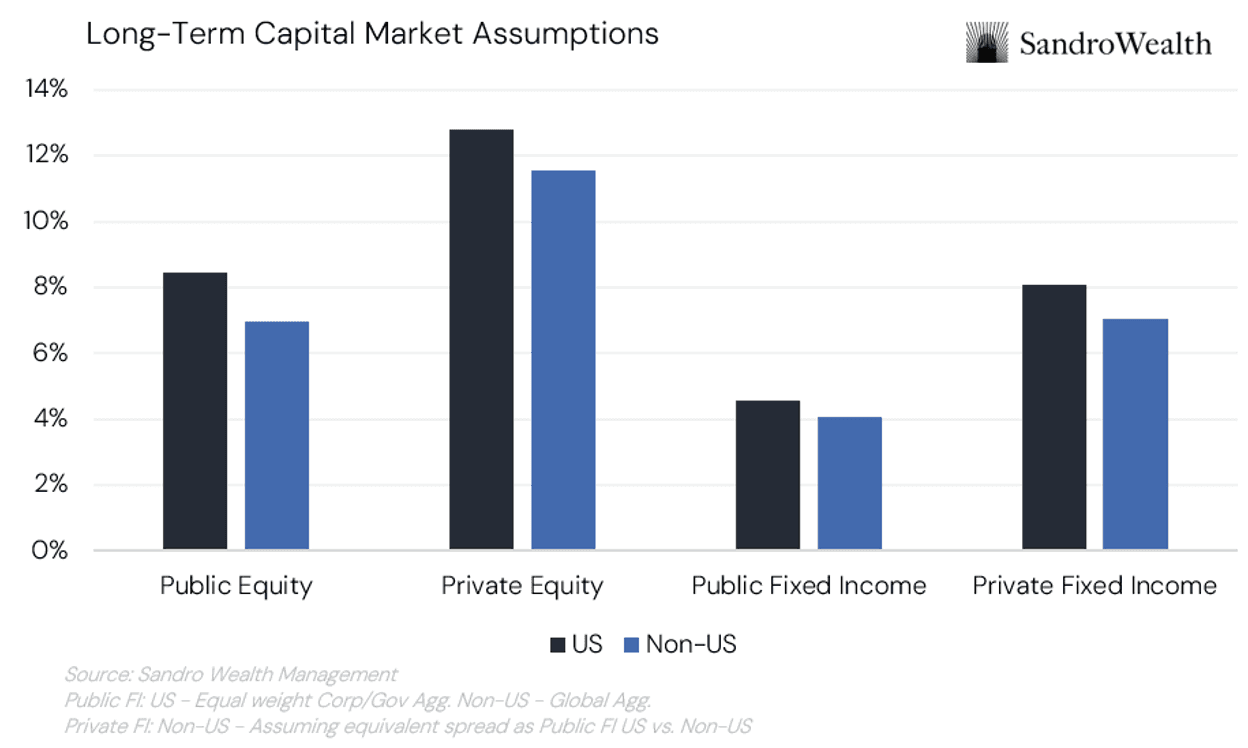 Importantly, America’s investment advantages are not limited to public markets. The forceswe listed today are just as relevant to asset classes like private credit and private equity. Inline with Sandro’s Total Portfolio Approach, we believe that private market allocations can potentially help investors more effectively achieve goals like wealth creation, higher income, and lower volatility. As in public markets, our GIF analysis demonstrates that investors will likely benefit from keeping their private market allocation heavily weighted to the US.