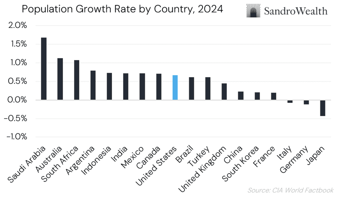 In terms of population growth, the US ranks ninth in our analysis. However, the US places well ahead of other developed countries, including Japan, France, and the United Kingdom. America also benefits from a highly productive population due to widespread technological diffusion.