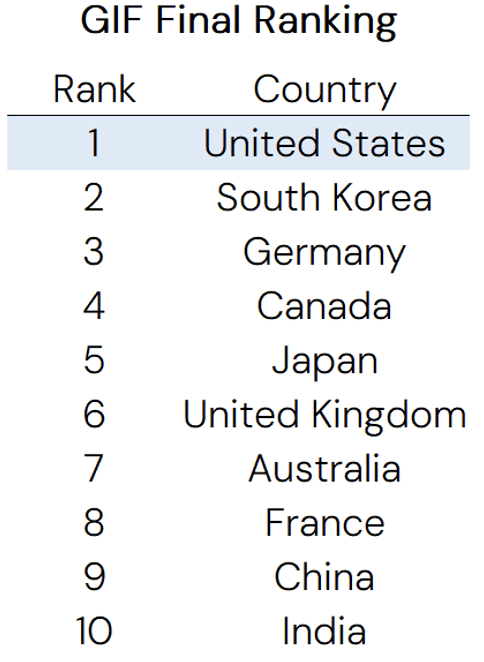 For example, Demographics contains eight subcategories, including Working Age Cohort Growth and Real GDP per Capita. A country that placed first in each subcategory would earn a Demographic score of 8, while a country that placed last in each subcategory wouldearn a Demographic score of 144. Thus, lower scores translate into higher investment potential under GIF.
