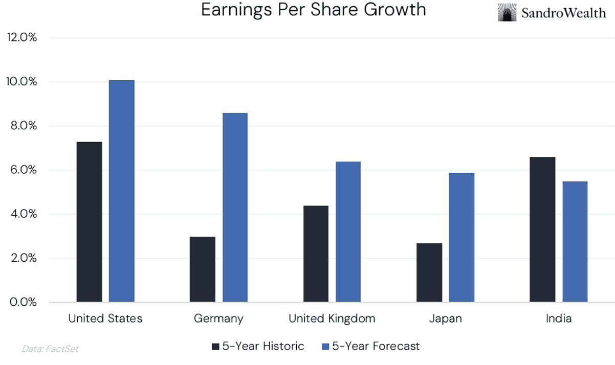 In part due to this sectoral composition, the US is highly competitive in terms of business profitability. Net margins in the US are far greater than many other developed markets and often exceed developing markets too. As a result, America is among the global leaders in terms of five-year historical and forecasted earnings per share growth.