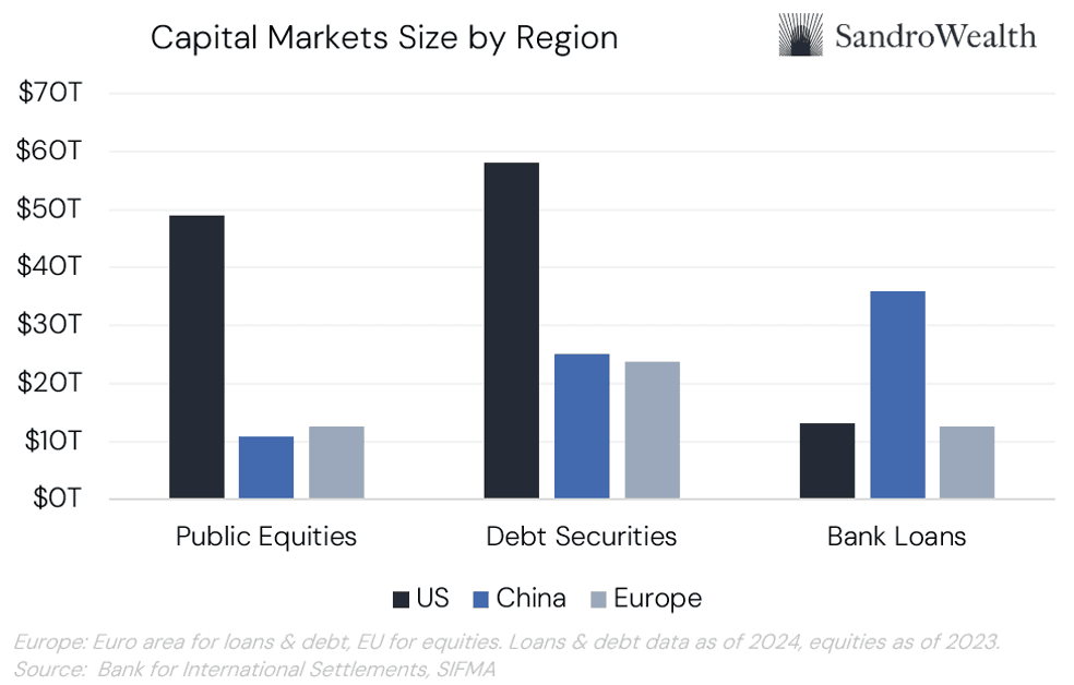America’s public equity markets are the largest in the world, eclipsing the value of Chinese markets by over 4 times and European markets by over 3 times. Moreover, America’s debt securities market is more than double the size of either China or Europe. While much of the US bond market is dominated by government securities, US corporations issue approximately $1.5 trillion in debt each year, indicating robust access to capital.