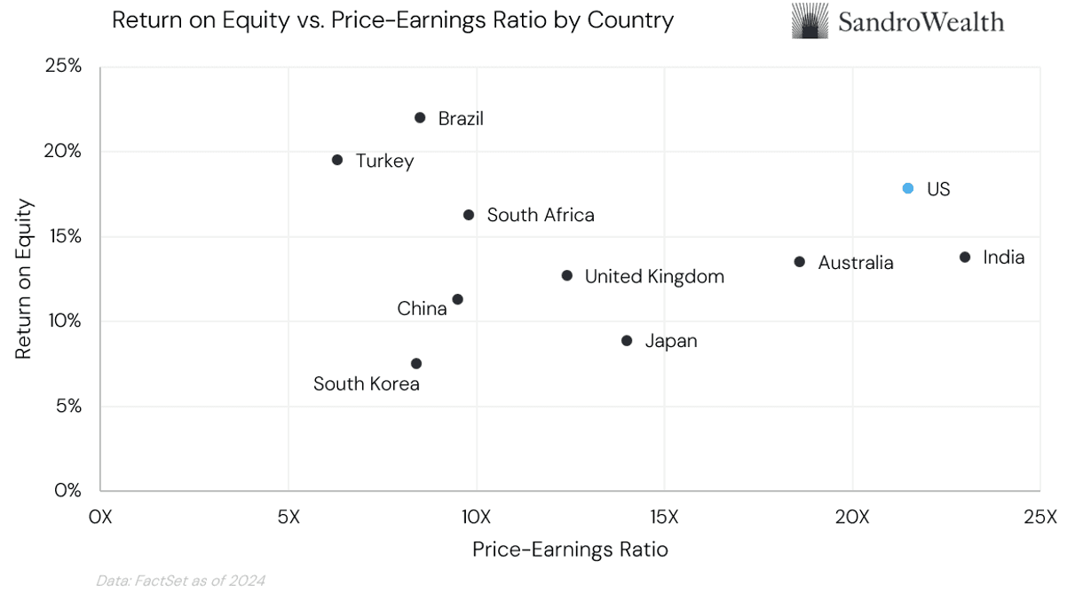 While many have pointed to high valuations as a reason to move away from US investments, we believe this perspective is short-sighted. We agree that valuations in the US are high on both an absolute and relative basis, but we also believe that these valuationsare justified. As we have demonstrated in our GIF analysis, America’s structural advantages create the potential for faster expansion than other markets. Perhaps most importantly, America’s historical return on equity is 40% higher than the average of all countries in our sample, offering substantial opportunity for US firms to reinvest capital to accelerate growth.